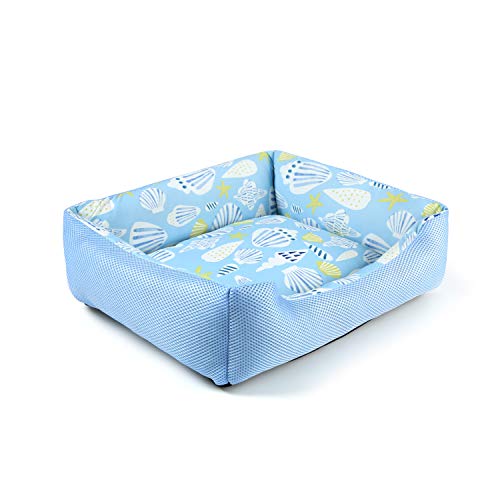 Peto-Raifuの貝殻柄ペットベッドは、小型犬や猫、小動物に最適な夏の暑さ対策グッズです。ひんやりとした冷感メッシュ素材と通気性の良いデザインで、快適な寝心地を提供します。ふわふわのクッションで心地よく、汚れても洗えるので清潔さを保てます。サイズは40*35*13cmです。