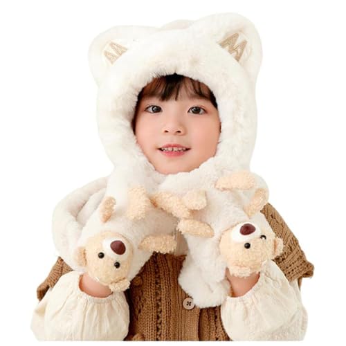 3 in 1のキッズ用マフラー・ネックウォーマーと手袋一体型帽子は如何でしょうか。耳付きでフワフワもここものかわいいデザインなので、お勧めですよ。