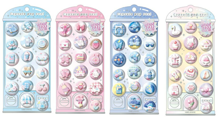 こちら、カプセルポップシール4種セットです。まんまるくてとてもかわいいですね。このままコレクションしたり、色々なものに貼って楽しめます。