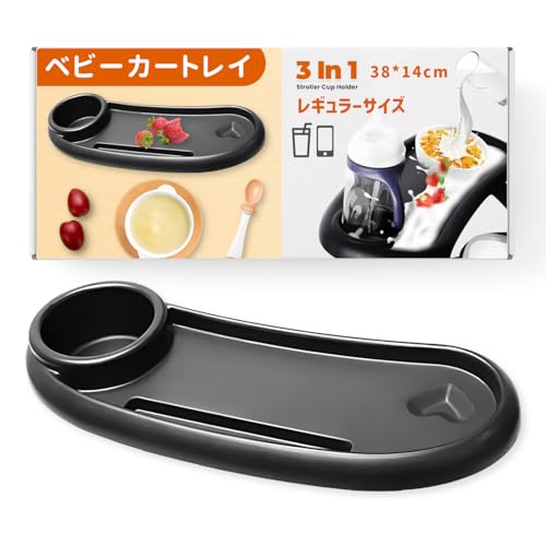 こちらの商品はいかがですか。ベビーカーに後付けすることができる便利なトレーです。ドリンクやちょっとしたベビーフード置きになります。また、ぐずってしまった際にスマホを見せたいなというときにも便利なホルダーも付いていますよ。取り付けも簡単ですし、おすすめです。