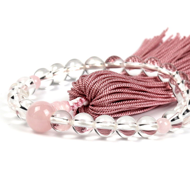 本水晶のシンプルな念珠はいかがでしょうか。ふさも落ち着いた色で華美でなく綺麗だと思います。