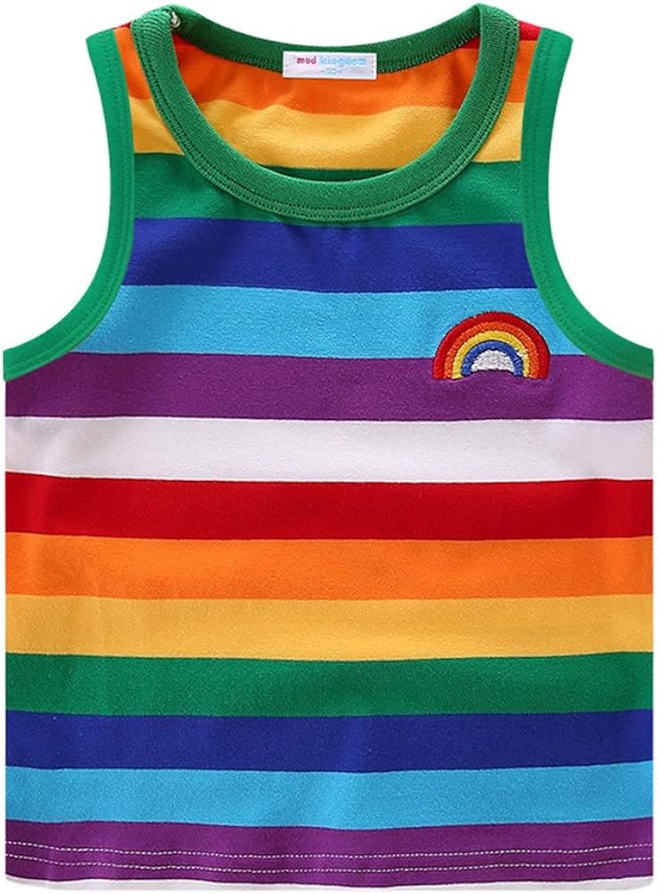 レインボーカラーのタンクトップです。Uネックなので首元ゆったりですね。素材もストレッチ性のものなので動き回る小さな体にもフィットして良さそうです。ショートパンツやチノパンに合わせるとカッコよく決まると思います。