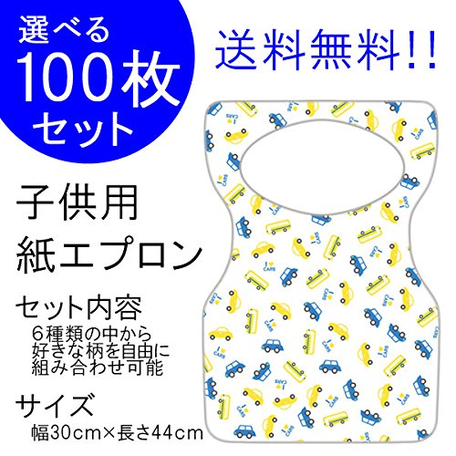 子ども用の紙エプロンです。100枚入りでコスパも良く、柄が6種類から選べて、かわいいのでおすすめです。