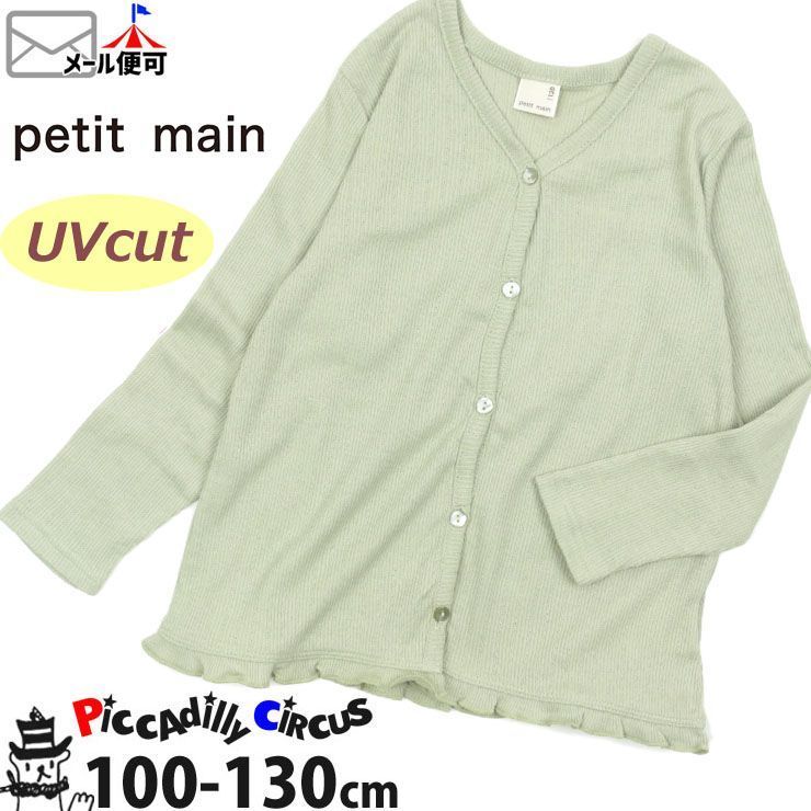 プティマインのUVカットカーディガンです。綿100%の針抜きカットソーで、春先のはおりにちょうどよい薄手。UVカット加工を施してあるので、紫外線対策にもおすすめです。コーデしやすい無地ですが、裾フリルがガーリーで可愛いデザインです。サイズ130㎝まであります。