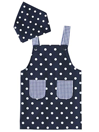 キッズ用のエプロンでシンプルなドット柄のネイビーカラーなので男女問わずに使えるので便利です。