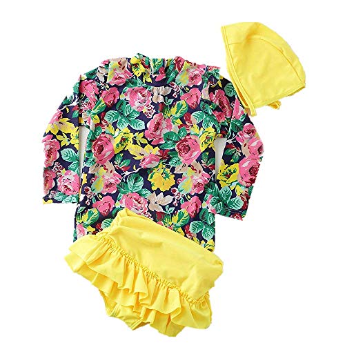 花柄のフリルのついたトップスとパンツとスイムキャップの3点セットの水着です。普段使いできる可愛いデザインなのでおすすめします。Mサイズが三歳に合うサイズになっています。