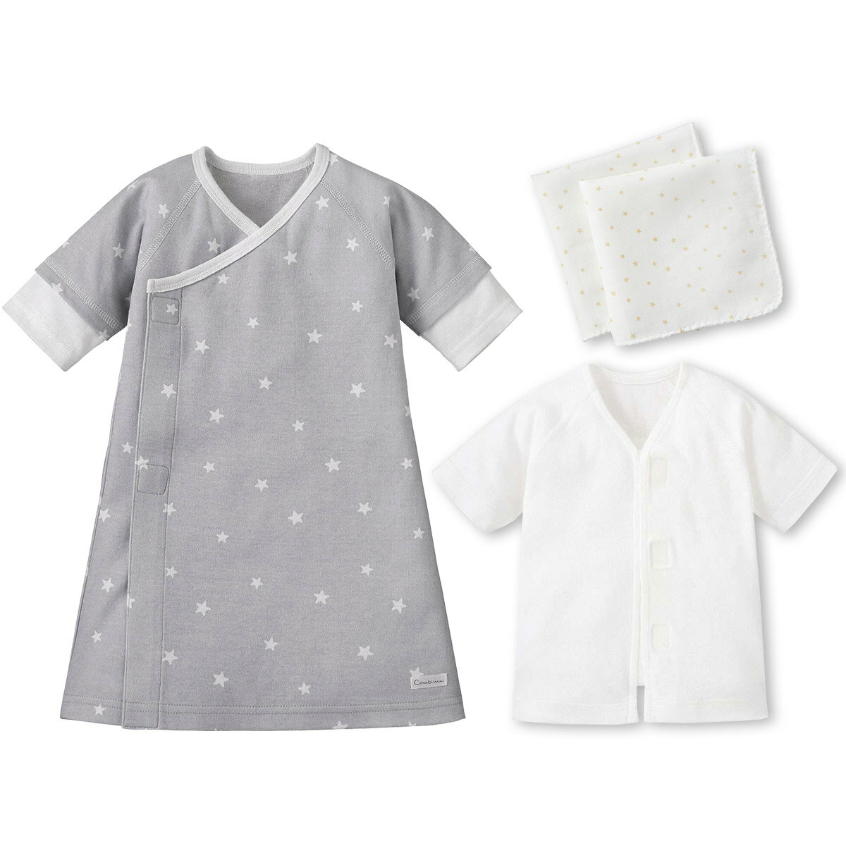 コンビミニの初めてラップドレスセットはいかがでしょう。綿100%で肌触りのいいスムース生地のラップドレス・着替えしやすいワンタッチテープ仕様の短肌着・ガーゼハンカチ2枚のセットで、お祝いギフトにぴったり。ヒラヒラがお好きじゃないということで、シックでスタイリッシュなモノトーンのトゥインクルスター柄をおすすめします。