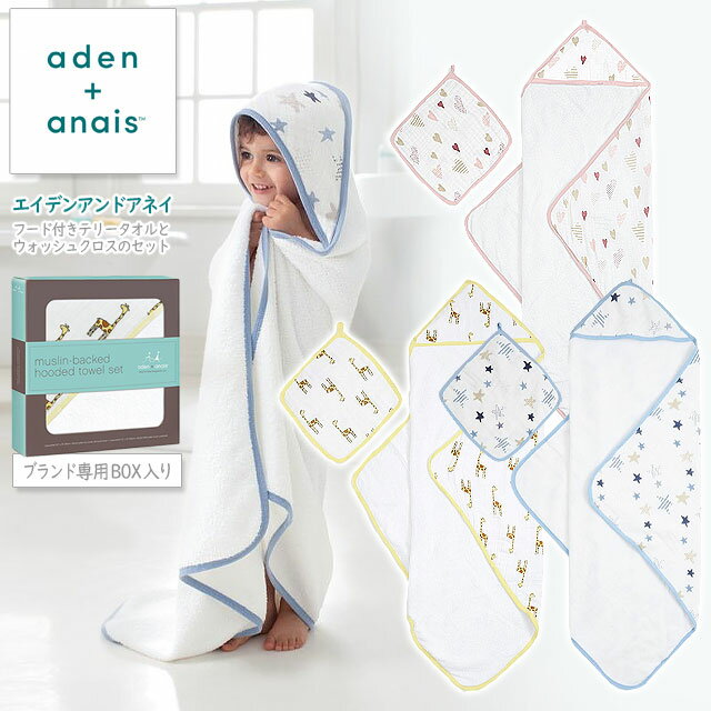 エイデンアンドアネイのフード付きテリータオルとウォッシュクロスのセットです。フード付きタオルは、おくるみのようにも使えるし、お風呂上りに頭からかぶれて、かなり大きくなるまで使えるアイテムです。ウォッシュクロスはモスリンコットンの4枚重ねで、お風呂タイムはもちろんハンドタオルなどにも幅広く使えるアイテム。ブランド専用BOX入りでギフトにおすすめです。