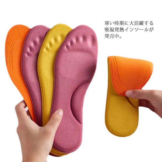 吸湿して発熱するだけでなく繊維間に暖気を保持するので暖かさが継続し衝撃吸収性も高いので長時間の歩行でも疲れにくいインソールをお勧めします。