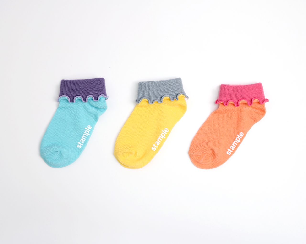 折り返しメロウフリルが可愛いので気分も上がるキッズ用アンクルソックスはいかがでしょうか。お得な3足セットですので洗い替え用に便利です。また、明るいオレンジ系やイエロー系とクールなブルー系の3色が揃っていますのでコーデの幅も広がります。