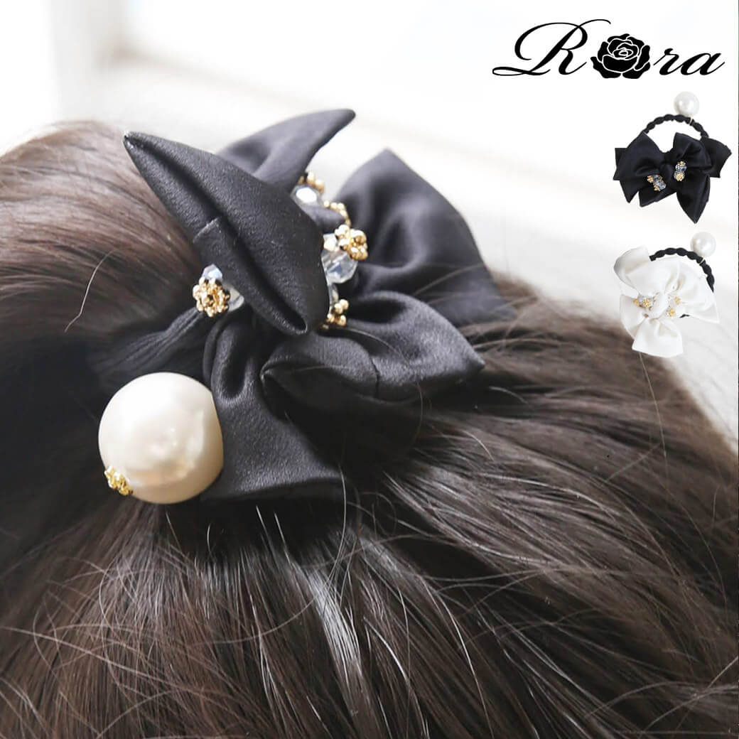 こちらのヘアゴムはいかがでしょう。3つのリボンを重ね、大粒の一粒パールとキラキラのクリアビーズをあしらった、ゴージャスなデザインのヘアゴムです。デザインは華やかですが、シックなブラックなので派手過ぎずフォーマルシーンにもぴったり。卒服に合わせてハーフアップをおしゃれに見せてくれると思います。