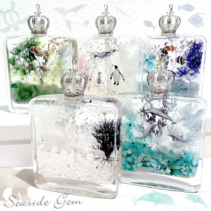 シーサイドジェムハーバリウムはいかがでしょう。スクエア型のボトルの中に海の世界が表現されています。ウミガメ、イルカ、ペンギン、シロクマ、熱帯魚の5種類から選べます。