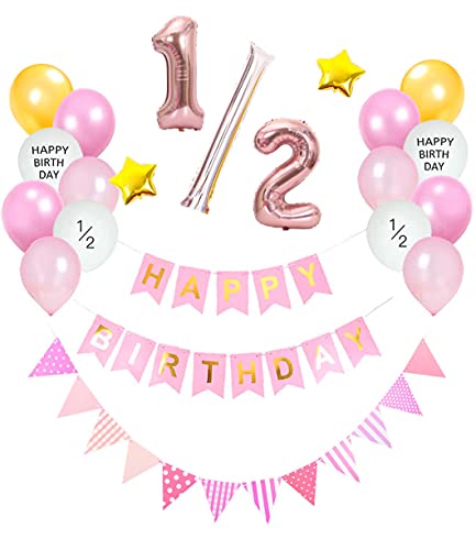 華やかなハーフバースデーの飾り付けセットはいかがでしょう。ピンクとイエローの風船にガーランドが2つ付いています。