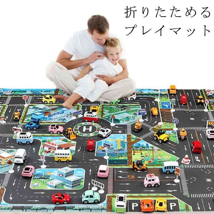 折りたたみ ベビープレイマットをおすすめ。大判の長方形のプレイマットで、防水素材で、食べこぼしや汚れが拭きやすく、道路柄4種から選べるので、クルマ遊びができる軽量折り畳みマットをおすすめです。