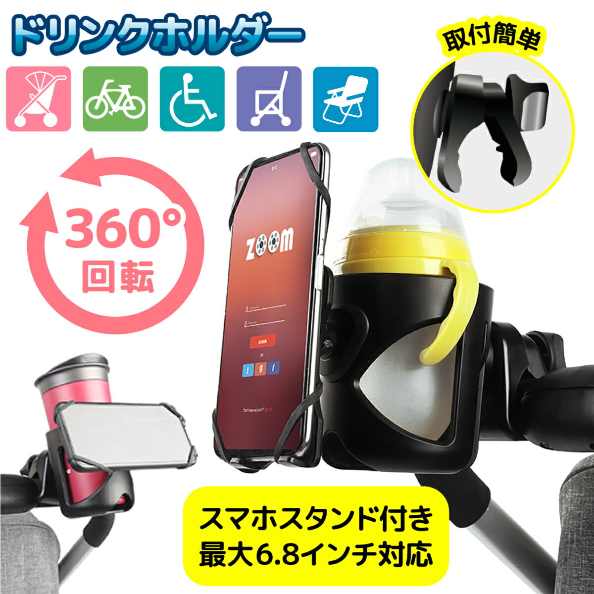 こちらのスマホホルダーがおすすめです。ベビーカーに設置出来ますよ。ドリンクホルダー付きなのが便利です。