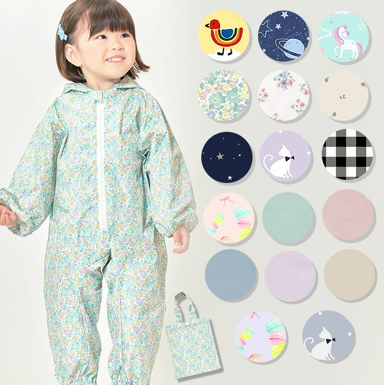 かわいい小花柄やシンプルなチェック柄など豊富な色柄から選べるこちらプレイウェアはいかがでしょうか。前ファスナーで着脱も簡単。防水生地に撥水加工がしてあるので防水効果が高く、水や汚れをしっかり防いでくれます。フードもついているので、レインウェアとしても活躍します。