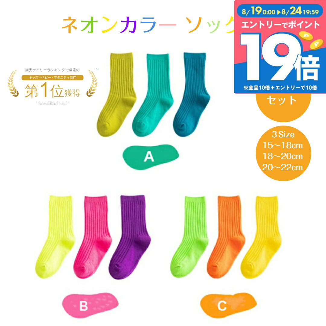 こちらの3足セットのネオンカラーの靴下はいかが。視認性も高く、生地も丈夫なのがいいです。運動会など行事事やダンスなどにも重宝し、ビビッドカラーで目立つのがいいですね。