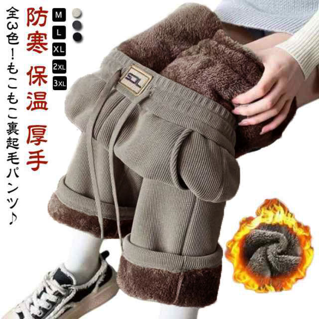 こちらのコーデュロイ素材のワイドパンツはもこもこの裏起毛で冬も暖かいですし、ウエストゴムできつくなくリラックスできます。