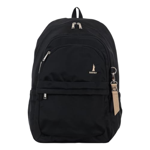 イーストボーイのリュックも人気!通学に最適なシンプルなブラックカラーにベージュでロゴのワンポイントとファスナーストラップがさし色になってお洒落!内側の裏布は紺色です。軽量のナイロン素材をテフロンコーティングした撥水性のある生地で雨の日も中が濡れません。32Lの大容量で便利なポケットも多数あります。A4ファイルより大きいB4サイズ対応なのでゆとりがあり使い勝手抜群!普段にもカジュアルに持てますよ。