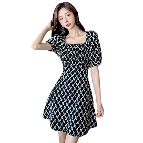 プックリ袖のバフスリーブがかわいいスクエアネックのミニワンピースはいかがでしょうか?鎖骨も綺麗に出る形です。黒に白のラインの模様入りで上品なイメージです。ハイウエストからAラインに広がるフレアスカートがフェミニンでかわいいです。脚長効果もあり肩の袖のボリュームとウエストマークでめりはりがあり華奢見え効果もあります。黒にはGOLD系の細いネックレスが映えると思います。通気性よく柔らかで着心地抜群!