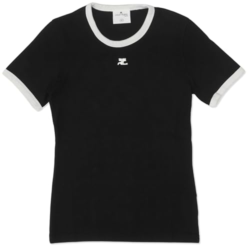 クレージュの半袖Tシャツはいかがでしょうか?ブラックに首回りと袖口の縁取りに白のさし色があり、胸の真ん中にワンポイントロゴマークがついたシンプルでシックなデザインです。ボトムスは白のパンツやスカートと合わせると大人っぽいコーデができると思います。