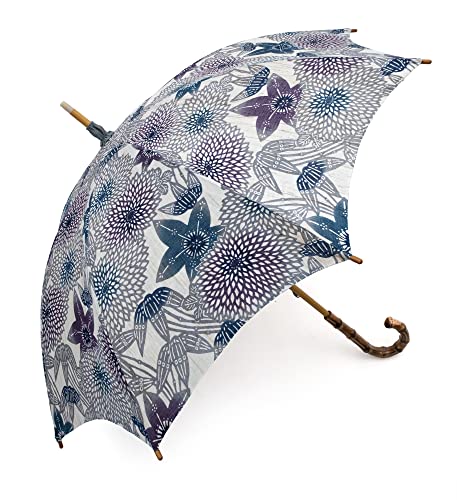 栗山工房のグレーの麻100%の生地に笹と菊の花が描かれた日傘はいかがでしょうか?持ち手の柄が節のある竹製で着物にぴったり!涼し気な印象のデザインです。沖縄の紅型という型染の技法と、京都の京友禅の技法を取り入れた作品です。8本骨で丈夫!フォーマルな着物にもよく似合う上品さで気品もありお薦めです。