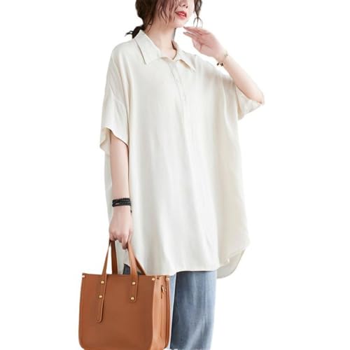 五分袖だから二の腕をカバーできる半袖のチュニックシャツです。ドロップショルダーでゆったりした大人可愛い半袖チュニックシャツで、体のラインを拾わないため、体型カバーができます。無地でカジュアルなデザインだから着回ししやすく、後ろが長めになって、ヒップラインをカバーします。色はふりーんと杏色の2色から選べます。