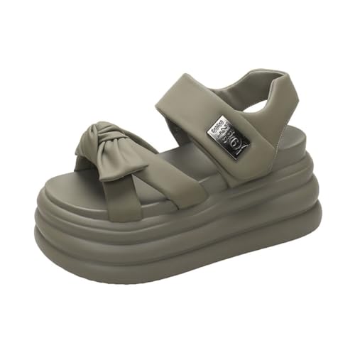 厚底で8cm身長UP!こちらのグリーンのサンダルはいかがでしょうか?ヒールは傾斜しておらずフラットな厚底でクッション性のあるウェッジソールが使用されており歩きやすさ抜群!インソールは低反発で快適!バッグベルトでフィット感もありベルクロタイプで着脱簡単!甲のストラップ2本のうちの前の1本にはリボン付きでかわいいです!アウトソールは滑り止めがしっかりきき歩きやすいですよ。コーデもしやすくお薦めです。