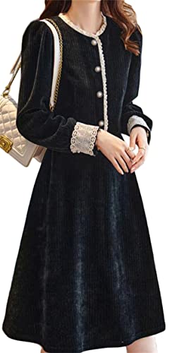 ボタン付きの黒い膝丈ワンピースで、上品で引き締まった印象でおしゃれです。コーデュロイ生地で高級感があります。綿混 素材でなめらかで着心地がいいです。