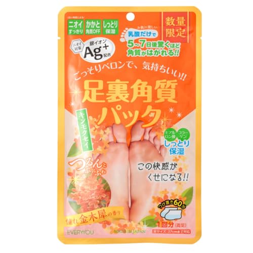 日用品・雑貨ブランド、EVERYYOU(エブリユー) の足裏角質パック 金木犀の香りです。銀イオンAg+配合、肌に優しい乳酸のパックで、使用した後5~7日で古い角質がペロンとはがれてかかと角質をOFFでき、古い角質によるニオイを解消できます。保湿成分のヒアルロン酸とコラーゲンを配合しているため、角質を除きつつしっとり保湿し、鎮静効果のあるやさしい 金木犀の香りを楽しむことができます。