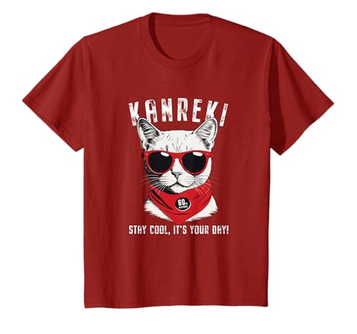 赤いフレームのサングラスと赤いスカーフを身につけたネコが描かれたこちらはいかがでしょうか。背後のKANREKIに気づかなければ、お洒落なTシャツで通ってしまいそう。カラーが少し暗めのクランベリー(写真)と定番のレッドから選べるのもお勧めポイントです。サイズはS~3XLです。