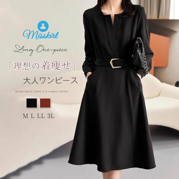 食事シーンの服装はお腹いっぱいになってもウェストが苦しくないワンピが良いですよね。こちらは後付けのウェストベルトで絞るタイプのワンピで調節が効きます。キレイ目生地で着丈の長いフレアスカートがエレガントなのでホテルランチもOKだと思います。オシャレな襟の形が特徴で、シャープに開いたV字部分がデコルテ周りをスッキリ見せてくれるので着やせ効果もありそう。サイズは3Lまであります。