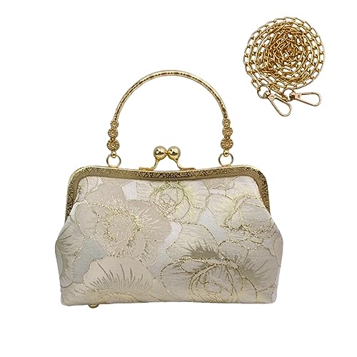 こちらは、上品な花柄に主張しすぎない程よいラメがキラリと華やかなパーティバッグです。パチッと口を開けられるがま口タイプなので中の物を取り出しやすいです。