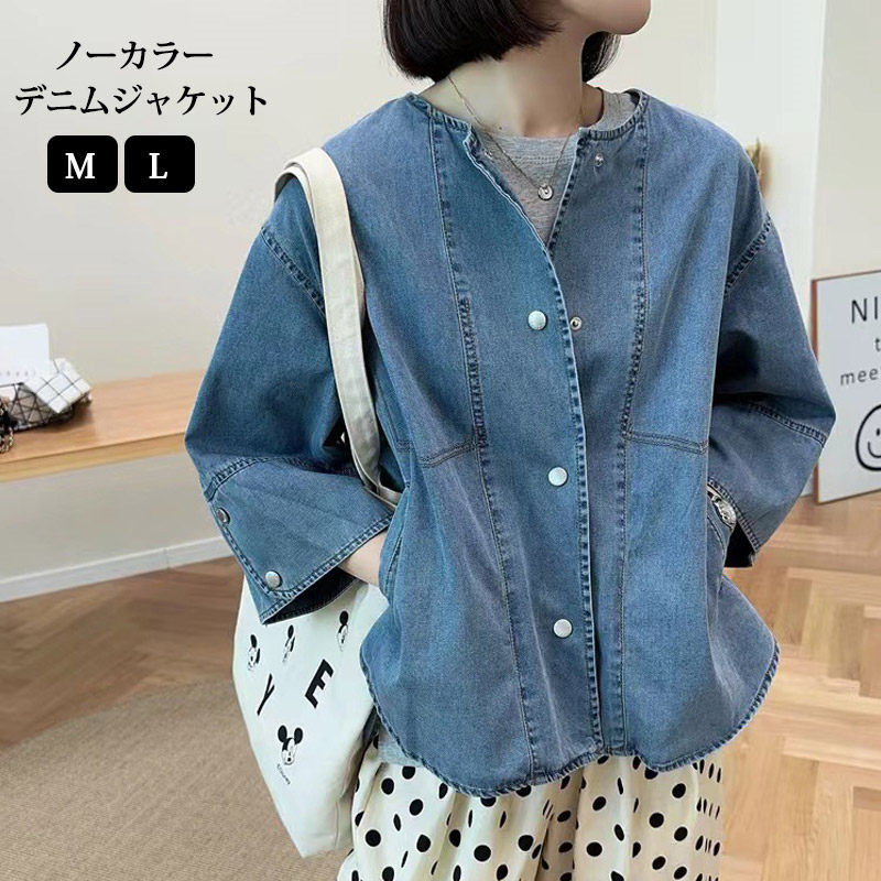 ゆったり、ラフに着られるのが今時なこちらはいかがでしょうか?重くなりがちなGジャンもライトカラーと七分袖で軽やかな印象に。ノーカラージャケットはどんなトップスとも相性抜群なので、流行りに左右されず、長く使えるかなと思いました。