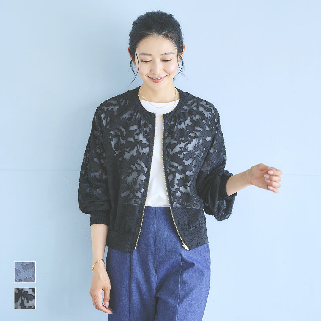 春にお召しになるシアージャケットは、真夏用程には透けない素材の方が季節感にそぐわしいと思いますので、シアージャガードはいかがでしょう?浮き出る花柄の美しさを楽しめると同時に透け感が抑えられて春らしい装いになるように思います。こちらのブルゾンは一見ショート丈で春っぽい軽快な雰囲気ですが、実はかなりの前後差身頃なのでしっかりお尻を隠せ、上手に体型カバーできるのもおススメポイントです。