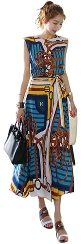 ブルー系にチェーン柄が入ったスカーフのようなプリント生地でできたノースリーブのトップスとロングスカートのセットアップはいかがでしょうか?お洒落できれいめなデザインなのでホテルのランチにも似合いそう!少し肌寒い春や夏の冷房対策に白のレースか透け感のある白のシアータイプの長袖ボレロを上に羽織ると温度調整できると思います。ウエストにはリボン付きです。50代女性に華やかさをプラスできるセットアップです!