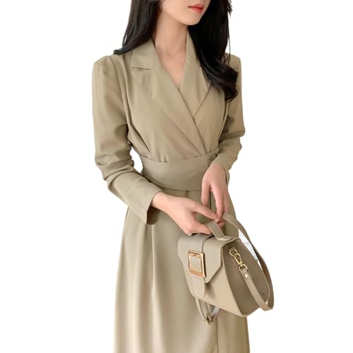こちらはいかがでしょうか。ジャケットのような形の襟と左右で幅が異なるベルトがユニークかつお洒落。ふくらはぎが隠れる丈のスカートがシックです。サイズはフリー、カラーはベージュ・カーキ・ブラックから選べます。