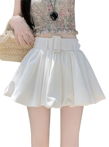 ホワイトカラーでAラインに広がるバルーンミニスカートはいかがでしょうか?裾にいくほど広がりふんわりボリュームもあります。ウエストベルト付でかわいいですよ。デニムのトップスと合わせるとカジュアルコーデで似合いそう!インナーパンんツ付きなので階段を上がる時や電車で座った時や風が吹いた時にも安心!通気性抜群で蒸れないです。素材はポリエステル100%。サイズはS-XLまで4段階あります。