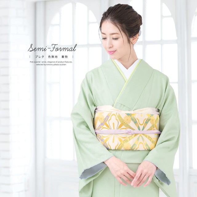 卒業式の母親コーデにお勧めの着物で、シンプルな無地イエローグリーンウォッシャブルになります。和装でしっとりと純和風を作ることができ、エレガントで上品な着付けがしやすい着物で、卒業式での記念撮影などが映えやすい着物になります。
