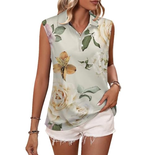 白地にローズ柄が入ったエレガントなノースリーブのポロシャツはいかがでしょうか?透け感のあるシアー素材の長袖インナーシャツを重ね着したらお洒落なコーデができそう!ボトムスには白のプリーツスカートや白のパンツを着るときれいめコーデができそう!これから春夏に向けてピッタリ。S-3XLまで幅広くサイズが揃っています。肌寒い日は上から白や紺のノーカラージャケットを羽織ってもお洒落ですよ。