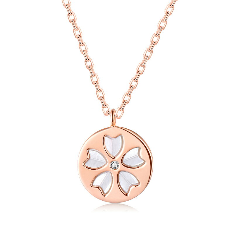 ピンクゴールドの本体に桜をモチーフとした白蝶貝、中央には一粒ジルコニアが彩られたかわいらしいネックレスだと思うので選んでみました。