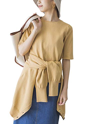 こちらのベージュのアンサンブルニット、五分丈で二の腕がしっかりと隠れて、襟も開きすぎず上品です。夏にかけてコーデしやすいアイテムですね。カーディガンも着やすく、どんなボトムスとも合わせやすいです。