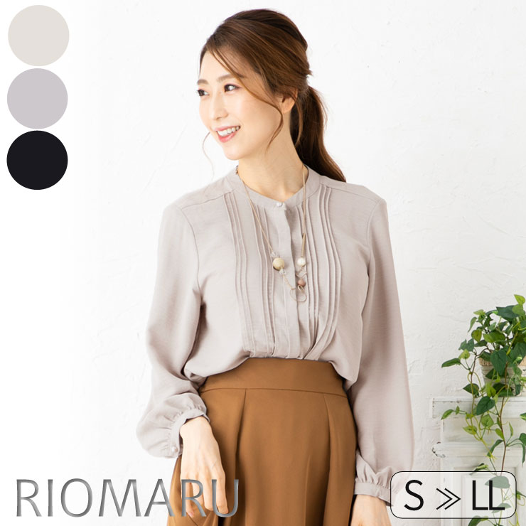 ジャケットのインナーに着るノーカラーの長そでブラウスをお探しでしたら、こちらはいかがでしょうか。フロントタックいパール調のボタンがおしゃれでスーツによく合うと思います。