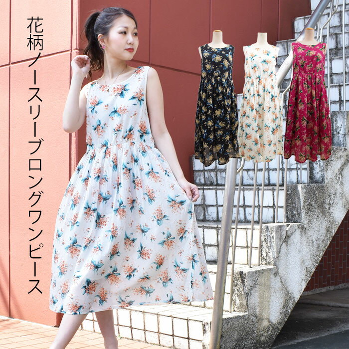 小花モチーフがかわいらしい雰囲気のロングワンピースです。ノースリーブで、着回ししやすいのがいいと思います。