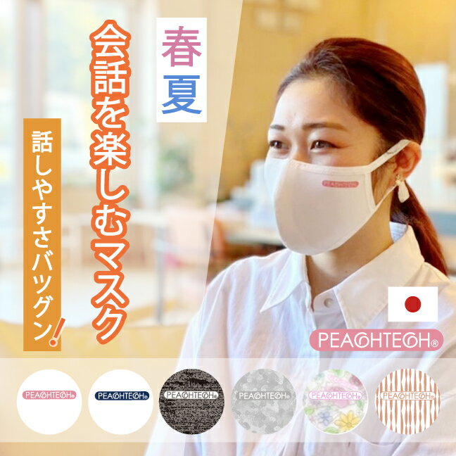 風合いの良い極細の上質な綿と、機能性素材の化繊を組み合わせたピーチテックという肌に優しい素材を使った日本製のマスクです。裏側の綿は吸水性がよくやわらかで、表側の化繊は速乾性に優れているので、透湿性が高く蒸れにくいのも肌に優しく、肌荒れに悩む方におすすめ。独自の立体パターンで口元に空間ができるので、呼吸がしやすく話もしやすいマスクです。無地の4色とプリント柄2色です。