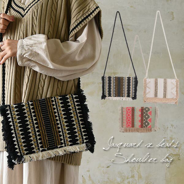 エスニックなショルダーバッグをお探しでしたら、こちらはいかがでしょうか。ジャガード織りとビーズの組み合わせがおしゃれなエスニック調のショルダーバッグです。コーディネートのアクセントになる素敵なデザインなのでおススメです。