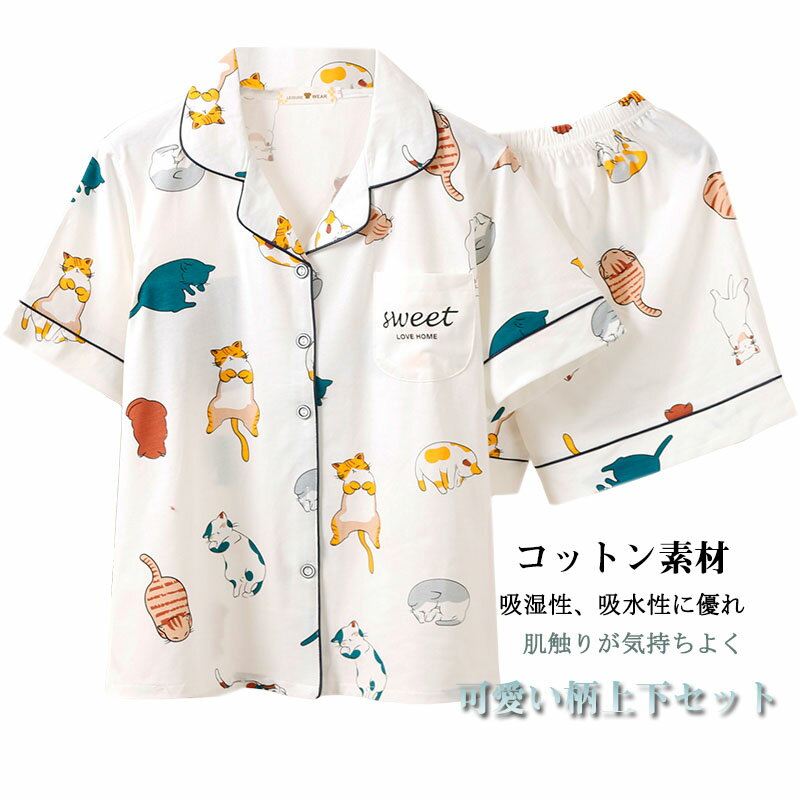 可愛い猫柄のパジャマはいかがでしょうか。前開きシャツ+ショートパンツのセットです。綿100%で肌触りも良くおすすめです。