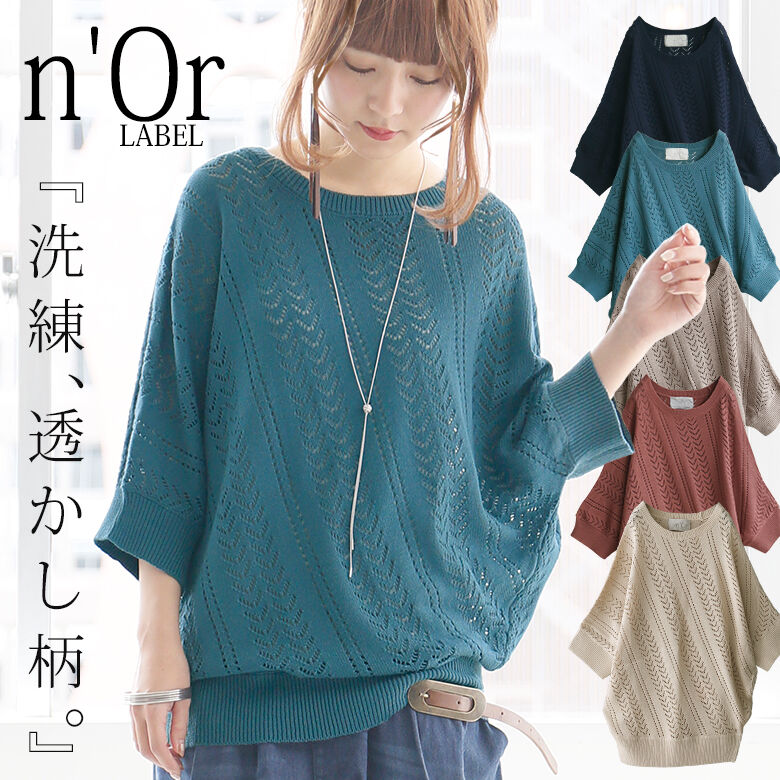 晩夏には五分~7分位の袖丈のニットが活躍しますね。こちらのセーターはいかがですか?素材は綿とアクリルなので夏寄りの素材ですし透かし編みなので涼し気でもあると思いますが、袖丈が長くカラバリにこっくりした色もあるので秋の気配も感じさせてくれて丁度よさそうだと思い選びました。モモンガみたいな形のドルマンスリーブなので身体の線は全く拾いませんから体型カバーにももってこいですよ。