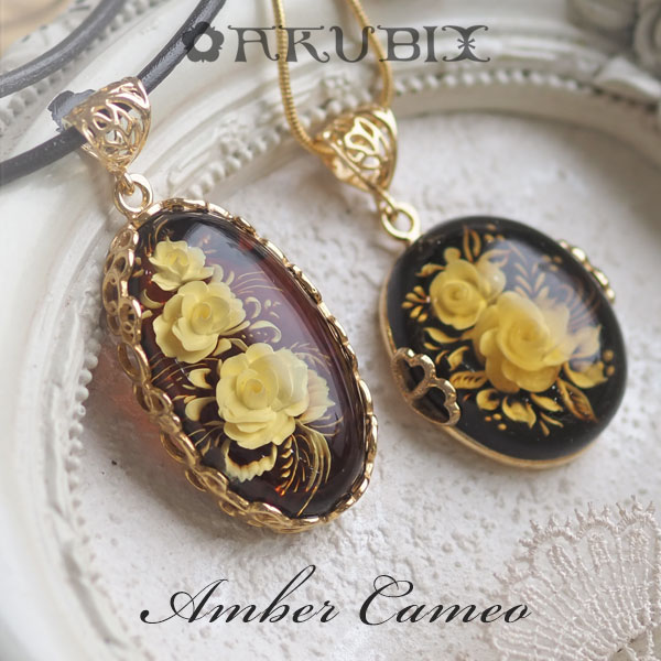 ご予算がたっぷりありますので、高級感のある琥珀のカメオペンダントをご紹介します。三種ありますが、いずれも深くて濃い色合いのベースに美しい琥珀色の薔薇が咲き誇るデザインで、茶系のコーデにはピッタリだと思います。チェーンか革かを選べますがおススメは革。マットな質感が秋の雰囲気をより強く感じさせてくれそうです。