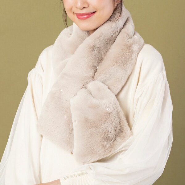 ふわふわした生地が優しげな印象のマフラーです。所々にあるパールビーズが品良くておすすめです。写真はパールが見えるように茶色ですが、ベージュもあります。